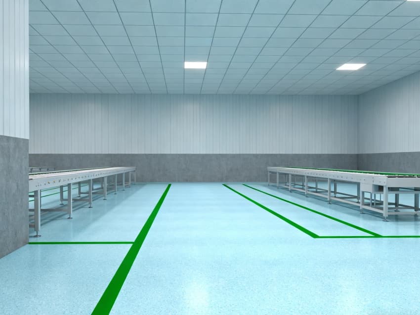 車間統(tǒng)一采用淺藍(lán)色耐磨環(huán)氧地面,兼具抗沖擊、易清潔特性,適配鈑金加工、總裝等多環(huán)節(jié)的設(shè)備安裝與物料轉(zhuǎn)運(yùn)需求;四周灰色防霉墻壁經(jīng)耐污處理,耐磨損且不易顯臟,配合頂部均勻布光系統(tǒng),營(yíng)造明亮舒適的生產(chǎn)環(huán)境。?