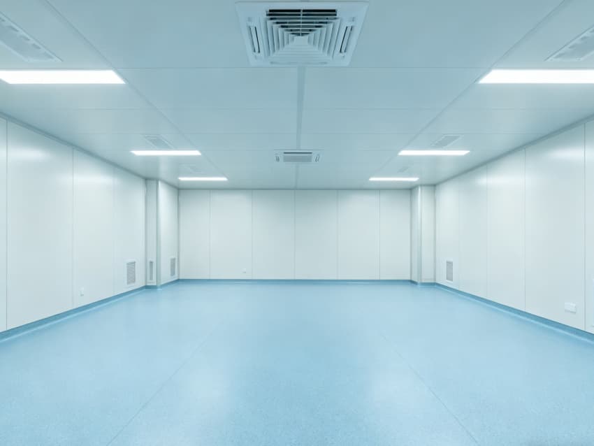 內部按功能劃分為六大潔凈區域:核心潔凈生產區(淺藍色防滑防霉地面)預留開闊空間,滿足發酵罐、純化設備等后期安裝;頂部潔凈送風區通過規整風閥系統,實現萬級潔凈度均勻送風;墻面過渡區采用圓弧轉角設計,避免粉塵堆積;密閉觀察區設雙層鋼化觀察窗,兼顧生產監控與無菌隔離;縱向設備預留區保留8米凈高,適配大型凍干設備動線;輔助緩沖區銜接車間入口,搭配風淋系統,實現人員/物料潔凈過渡。整體空曠布局既保障潔凈操作空間,又滿足皖北生物制藥企業靈活擴產需求,為本地藥企提供合規、高效的生產載體。