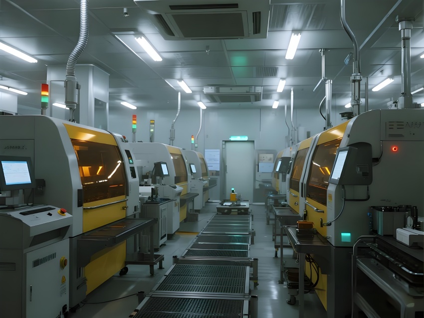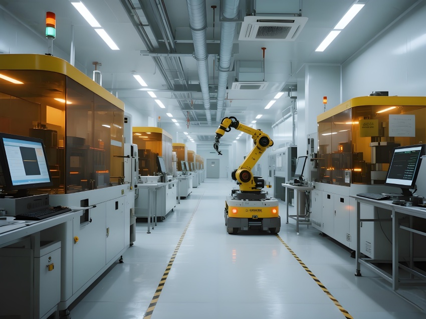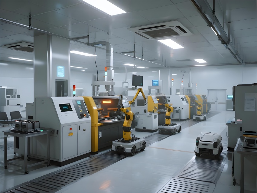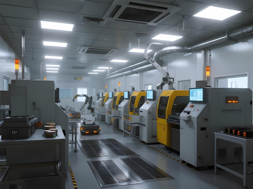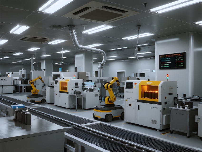 本車間以“精密制造+極致潔凈”為核心,采用未來(lái)工業(yè)風(fēng)設(shè)計(jì),主色調(diào)為冷銀灰與警示黃,強(qiáng)化功能分區(qū)。頂棚矩陣式FFU單元配合地面格柵回風(fēng),形成垂直層流,藍(lán)色氣流軌跡可視化突顯潔凈度。電極區(qū)配備全封閉涂布機(jī),機(jī)械臂精準(zhǔn)運(yùn)作;電芯裝配區(qū)采用防靜電工作臺(tái),激光焊接火花與冷色調(diào)環(huán)境形成對(duì)比。注液區(qū)全封閉氮?dú)馐痔紫浯钆溏晟瘓?bào)燈,確保絕對(duì)干燥。化成區(qū)排列著智能溫控柜,數(shù)據(jù)看板實(shí)時(shí)監(jiān)控電池參數(shù)。AGV機(jī)器人沿磁軌穿梭,與懸吊式管道系統(tǒng)構(gòu)成高效物流網(wǎng)絡(luò)。整體空間融合精密機(jī)械的冷峻美學(xué)與智能制造的科技感,打造高可靠性的鋰電池生產(chǎn)環(huán)境。