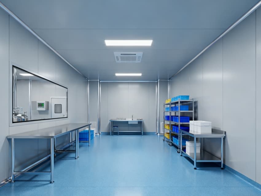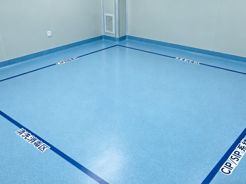 設(shè)計(jì)在環(huán)境防護(hù)上針對(duì)性突出:地面采用藍(lán)色耐腐環(huán)氧材質(zhì),可耐受酸堿類藥劑侵蝕,且無縫拼接設(shè)計(jì)便于清潔消毒;四周淺灰色抗菌墻壁采用防霉涂層處理,配合圓弧墻角結(jié)構(gòu),避免藥液殘留與粉塵堆積,搭配頂部層流送風(fēng)系統(tǒng),能穩(wěn)定維持萬級(jí)潔凈度,滿足藥劑配液對(duì)微環(huán)境無菌性的嚴(yán)苛要求。