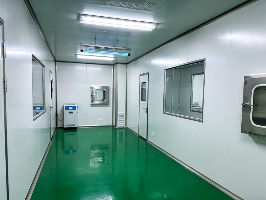 整體空間采用醫(yī)藥級潔凈圍護體系:墻面與頂板選用抗菌型潔凈彩鋼板,搭配圓弧角收邊與密封膠條,徹底消除積塵死角;地面為綠色防靜電環(huán)氧自流平材質(zhì),表面光滑耐磨、易清潔消毒,同時具備靜電消散功能,避免靜電對藥品的潛在影響。吊頂集成 FFU 風機過濾單元與恒溫恒濕控制系統(tǒng),可穩(wěn)定維持十萬級潔凈度與 18-26℃的工藝環(huán)境,通過壓差管控保障各區(qū)域空氣單向流動,有效防止交叉污染。