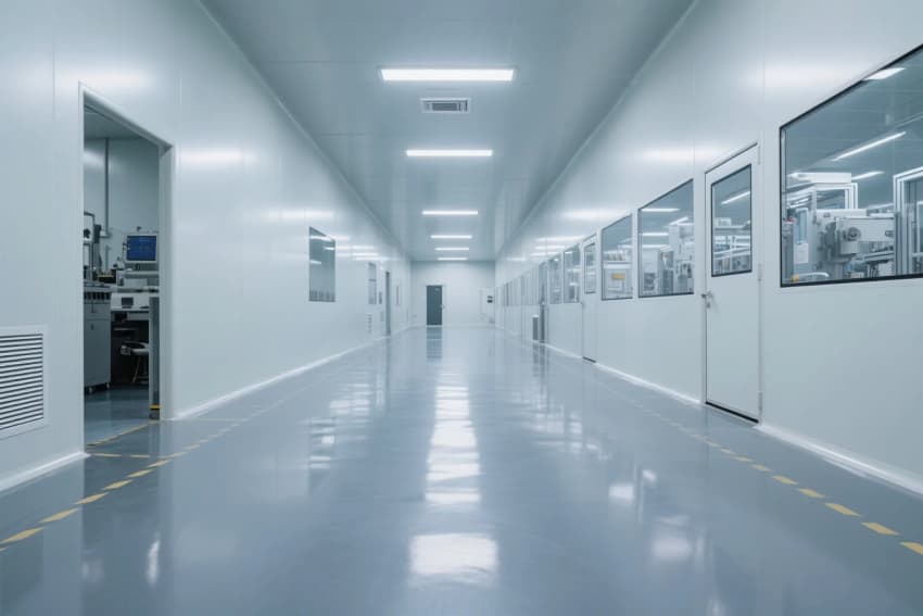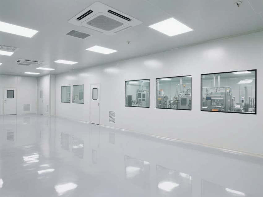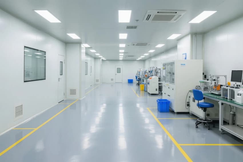 本工程嚴格依據(jù)ISO14644-1Class7潔凈標準,采用"工業(yè)4.0"設(shè)計理念,打造智能化電子光伏生產(chǎn)環(huán)境。主體結(jié)構(gòu)采用模塊化潔凈室系統(tǒng),50mm厚深灰抗菌彩鋼板墻體與淺灰防靜電環(huán)氧自流平地坪形成未來工業(yè)美學(xué)基調(diào),表面電阻穩(wěn)定控制在10^6-10^9Ω范圍。