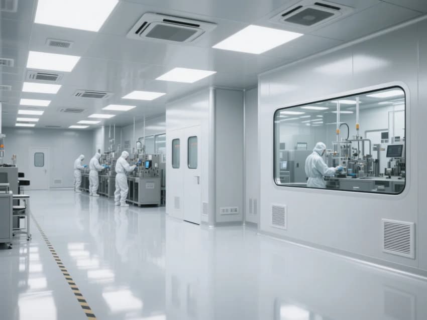 智能控制系統(tǒng)集成環(huán)境監(jiān)測(溫濕度/潔凈度/壓差)、設(shè)備聯(lián)動和能源管理三大模塊,通過墻裝LED智能看板實現(xiàn)數(shù)據(jù)可視化。照明系統(tǒng)采用600x1200mm潔凈平板燈,照度維持800Lux±10%,重點工位增設(shè)局部黃光照明。工程整體通過模塊化設(shè)計、智能化控制和標準化施工,實現(xiàn)電子光伏廠房在潔凈度、能效比和生產(chǎn)效率的最優(yōu)平衡。