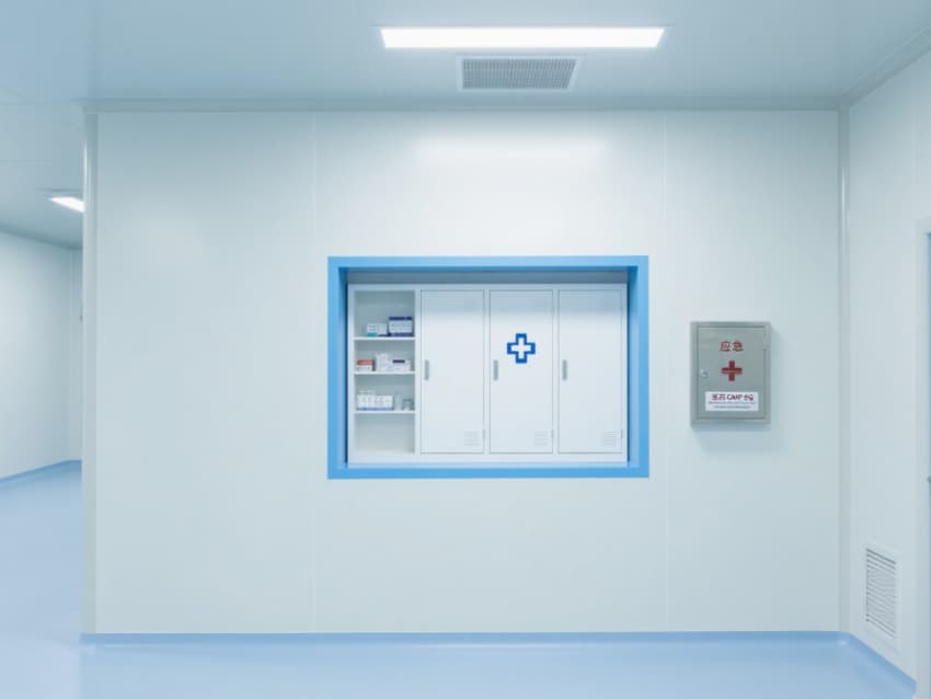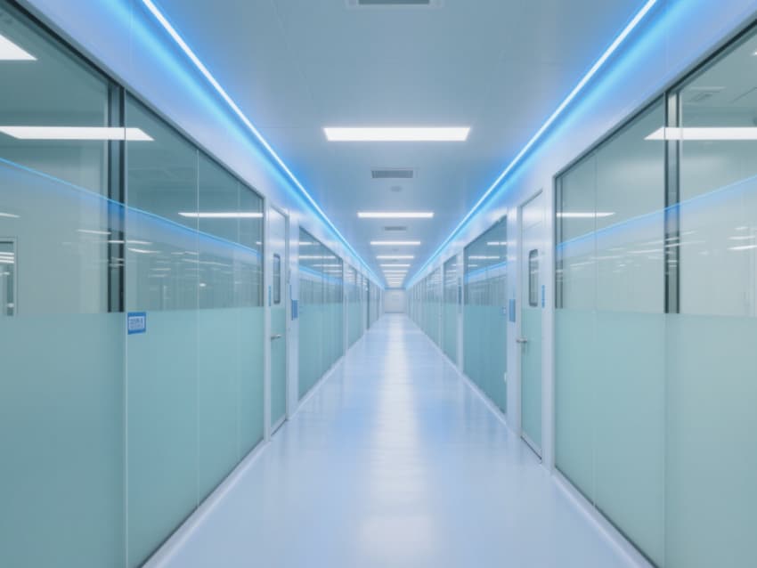 走廊與操作區(qū)通過玻璃隔斷分隔,門框與墻角均做圓角處理,配備嵌入式不銹鋼傳遞窗。地面標(biāo)識(shí)線采用醫(yī)用藍(lán)啞光材質(zhì),指引動(dòng)線的同時(shí)避免反光干擾,整體空間雖無設(shè)備,卻通過細(xì)節(jié)設(shè)計(jì)全方位展現(xiàn)醫(yī)藥生產(chǎn)的嚴(yán)苛潔凈要求。