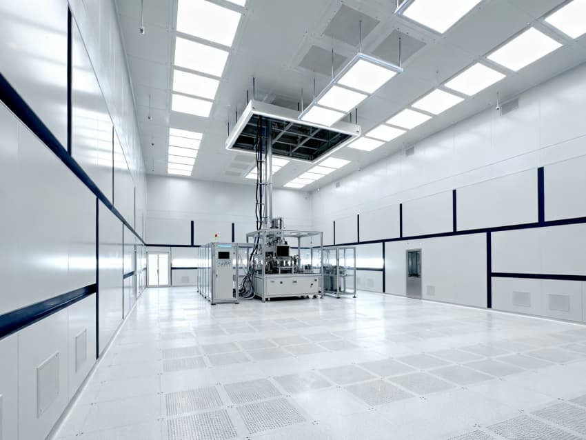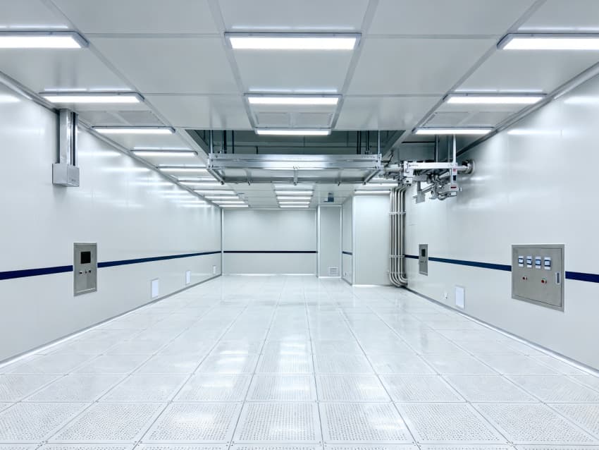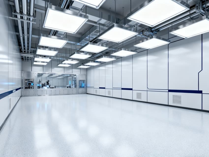 內部6個量子車間均為無設備空曠布局,按千級潔凈標準與防電磁干擾要求建設:地面鋪設防靜電環氧自流平,墻面采用無磁不銹鋼潔凈板,陰陽角做R50圓弧處理;柱網間距設為8米,預留充足設備安裝與運維空間;頂部整合恒溫恒濕系統、高效送風口及防眩光LED照明,設備管線暗藏設計,進一步強化空間空曠感,為量子芯片測試、量子傳感研發等場景提供穩定、潔凈的專屬環境。