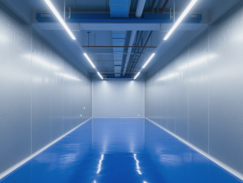 車間內部整體呈銀灰色和藍色,給人一種現代感和科技感。墻面、地面和天花板均采用無縫設計,便于清潔和消毒,防止灰塵和微粒的積聚。照明系統明亮且均勻,提供了良好的工作環境。