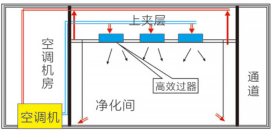 2、單夾層、集中送風(fēng)、上夾層為靜壓箱.