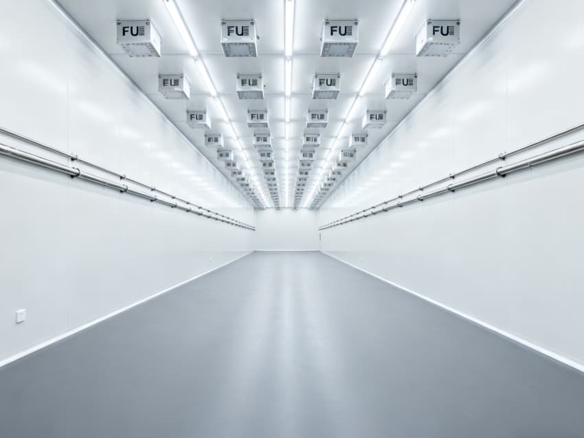 內部6個生產車間均為無設備空曠布局,按百級潔凈標準建設:地面鋪設防靜電環氧自流平,墻面采用無顆粒潔凈彩鋼板,陰陽角做R30圓弧處理杜絕積塵;柱網間距設為9米,預留光刻機、晶圓檢測設備等重型設備安裝點位;頂部整合恒溫恒濕系統、高效空氣過濾器及防頻閃LED照明,所有管線暗藏于吊頂內,最大化釋放空間高度,為芯片晶圓制造、封裝測試等核心環節提供超潔凈、高穩定的專屬生產環境。