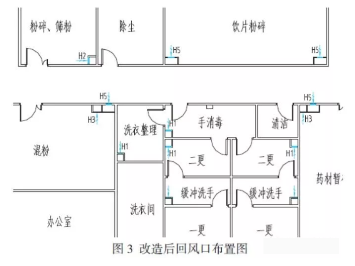 在使用中問題就來了,低壓力級別房間潔凈度不達標,只能開大送風口閥門。后來,要么房間受污染空氣漏至外潔凈走廊,污染整個區域,要么潔凈走廊風吹進這些低壓力房間,導致其無法回風,房間新風量嚴重不足,嚴重影響使用,使用方只能關閉潔凈空調進行生產。這樣,運行不到一年就進行改造設計。