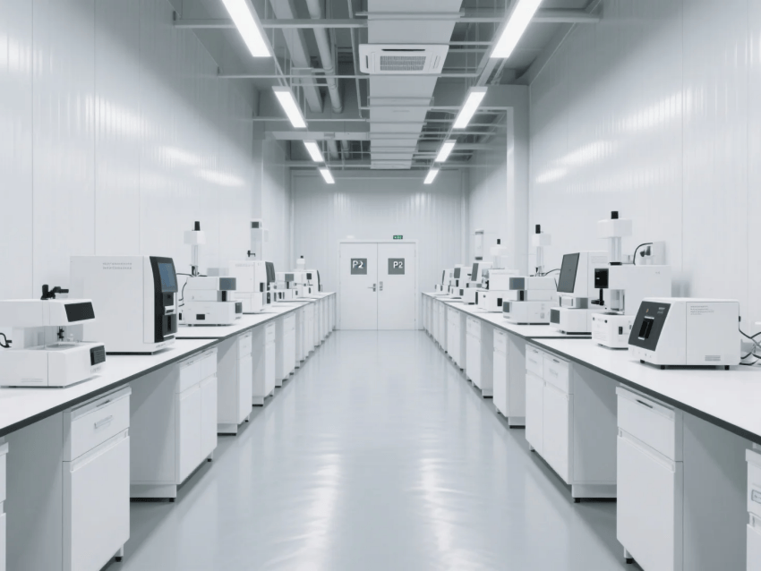 本實驗室嚴格遵循《生物安全實驗室建筑技術規范》GB50346標準,以"科技純凈"為設計理念,通過象牙白彩鋼板墻體與淺灰環氧樹脂地坪的極簡組合,打造符合P2防護要求的現代化研發空間。