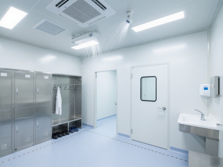 實驗室以白色抗菌彩鋼板構建墻體與吊頂,搭配淺藍灰色防靜電環氧地坪,整體色調簡潔明快。墻面與地面的圓弧角設計避免積塵,便于高頻次消毒清潔。頂部高效過濾器形成單向流氣流,每小時15-20次空氣置換,維持室內正壓以防外界污染。?