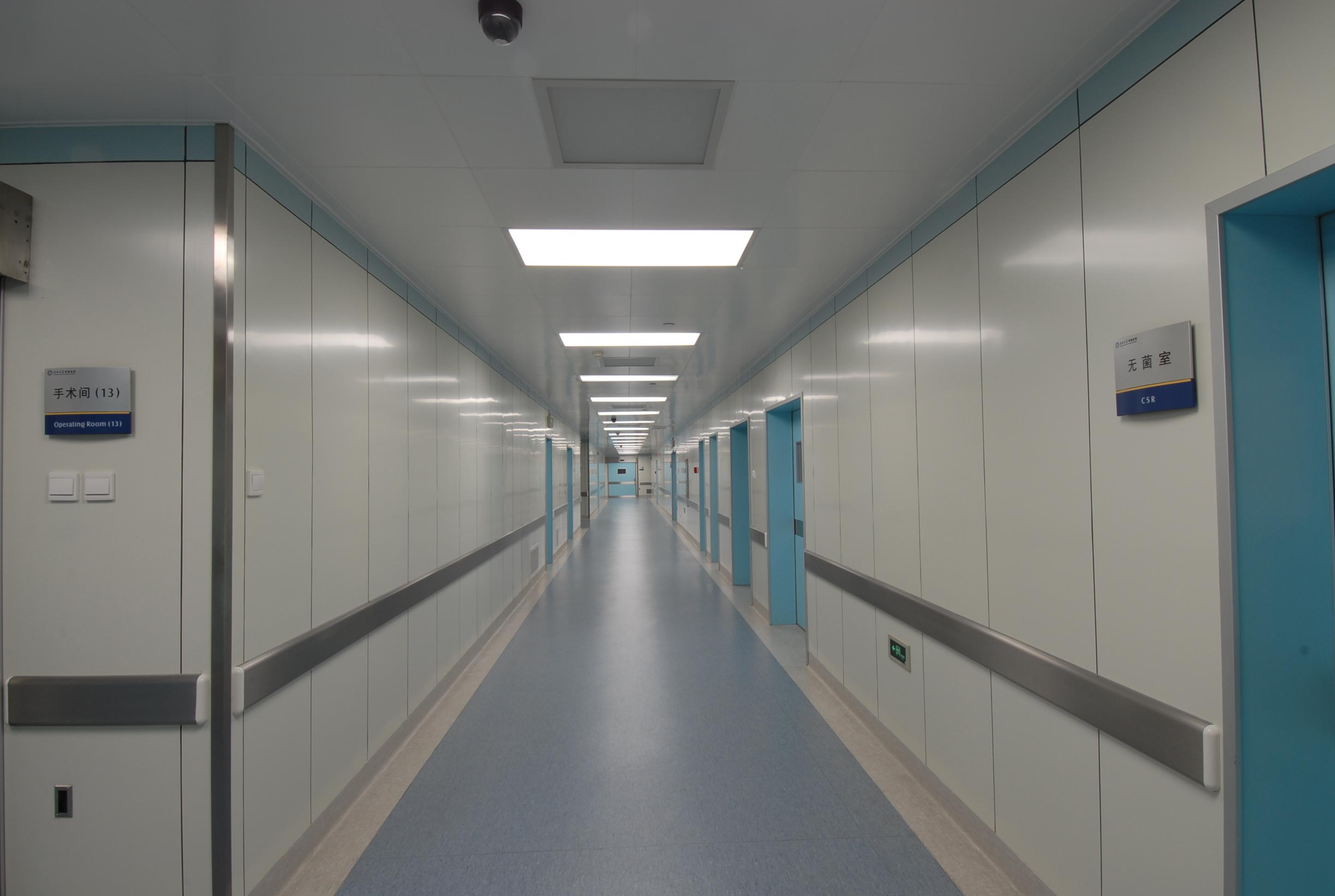 手術(shù)部墻體及吊頂均采用防菌50系列夾芯彩鋼隔熱板,企口型,厚度為0.426mm,雙面貼膜,潔凈手術(shù)室墻面必須達(dá)到無縫、氣密效果,色彩符合現(xiàn)代手術(shù)室的要求,視覺感觀舒適。潔凈走廊加裝200mm寬厚度為0.8mm不銹鋼防撞帶。